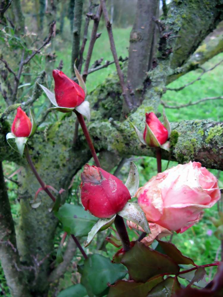 Le ultime rose, sorprese dal gelo, restano lì, indecise se schiudersi, abbracciate al prugnolo, spolpato dai merli - e il prugnolino adesso come lo faccio?